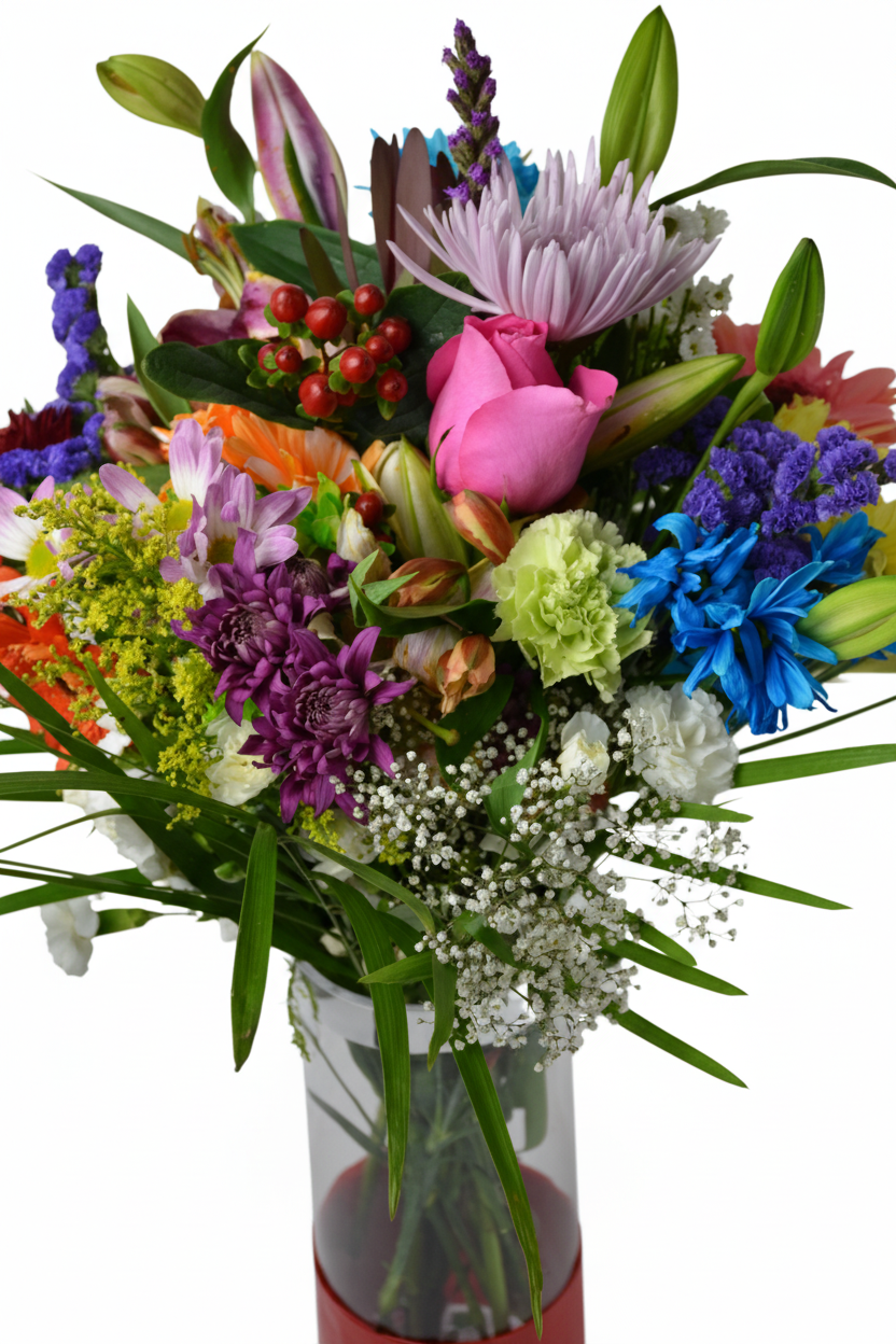 The Global Garden Delight bouquet showcases a masterful blend of vibrant colors and textures. Bright pink roses create a classic focal point, while lush chrysanthemums in pale lavender and deep purple add depth. Green lily buds promise evolving beauty, complemented by electric blue hydrangea or dahlias that provide a striking cool contrast. An unexpected burst of bright lime green carnations or mums injects freshness, making this arrangement a sophisticated, dynamic collection ideal for those seeking a vivid and expertly crafted floral display.