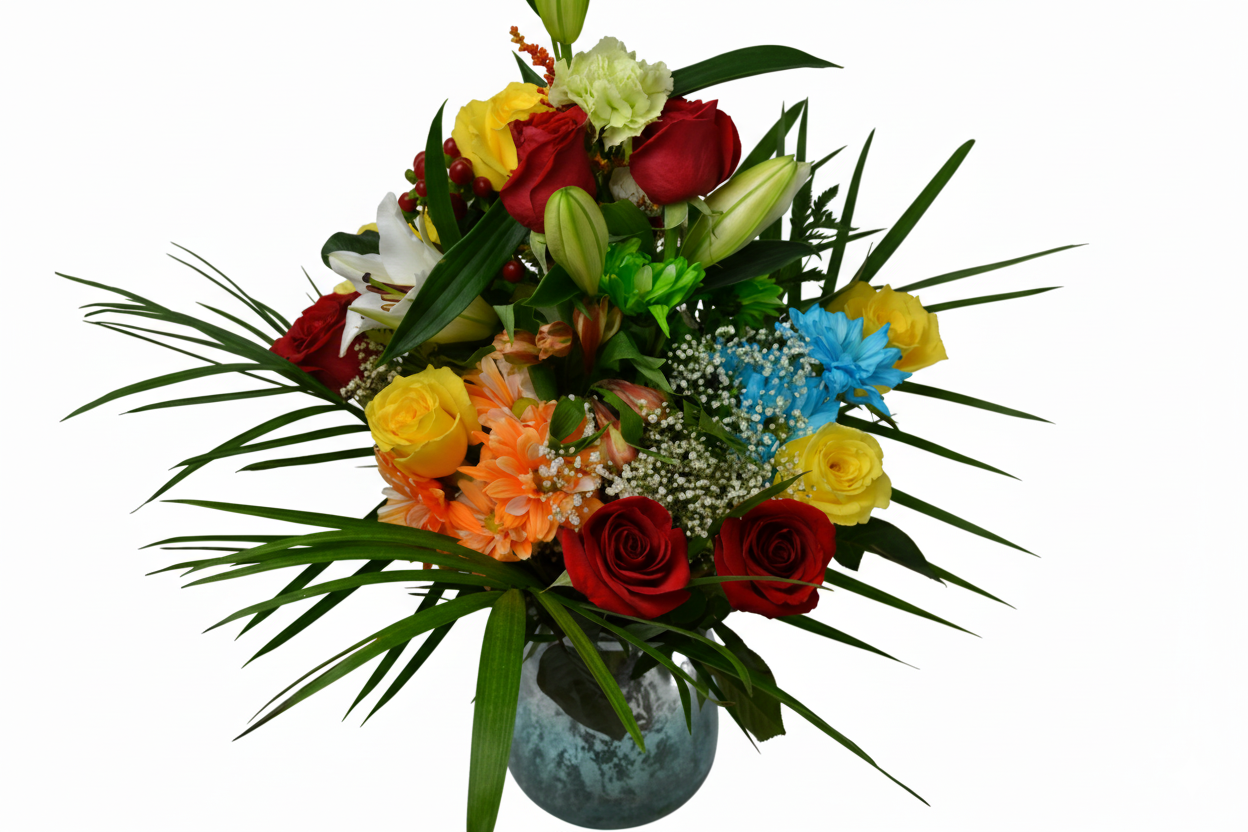 Experience the vibrant harmony of colors and textures in Joyful Burst, a floral arrangement designed to captivate. Set in a round, speckled blue-green vase, this bouquet combines classic red and yellow roses with elegant white and green-budded lilies that create height and sophistication. Bright orange Gerbera daisies and Alstroemeria bring warmth, while clusters of blue and lime green chrysanthemums add a modern, unexpected twist. Creamy carnations near the center and delicate Baby’s Breath complete this expertly crafted arrangement, perfect for bringing joy and refined beauty to any space.