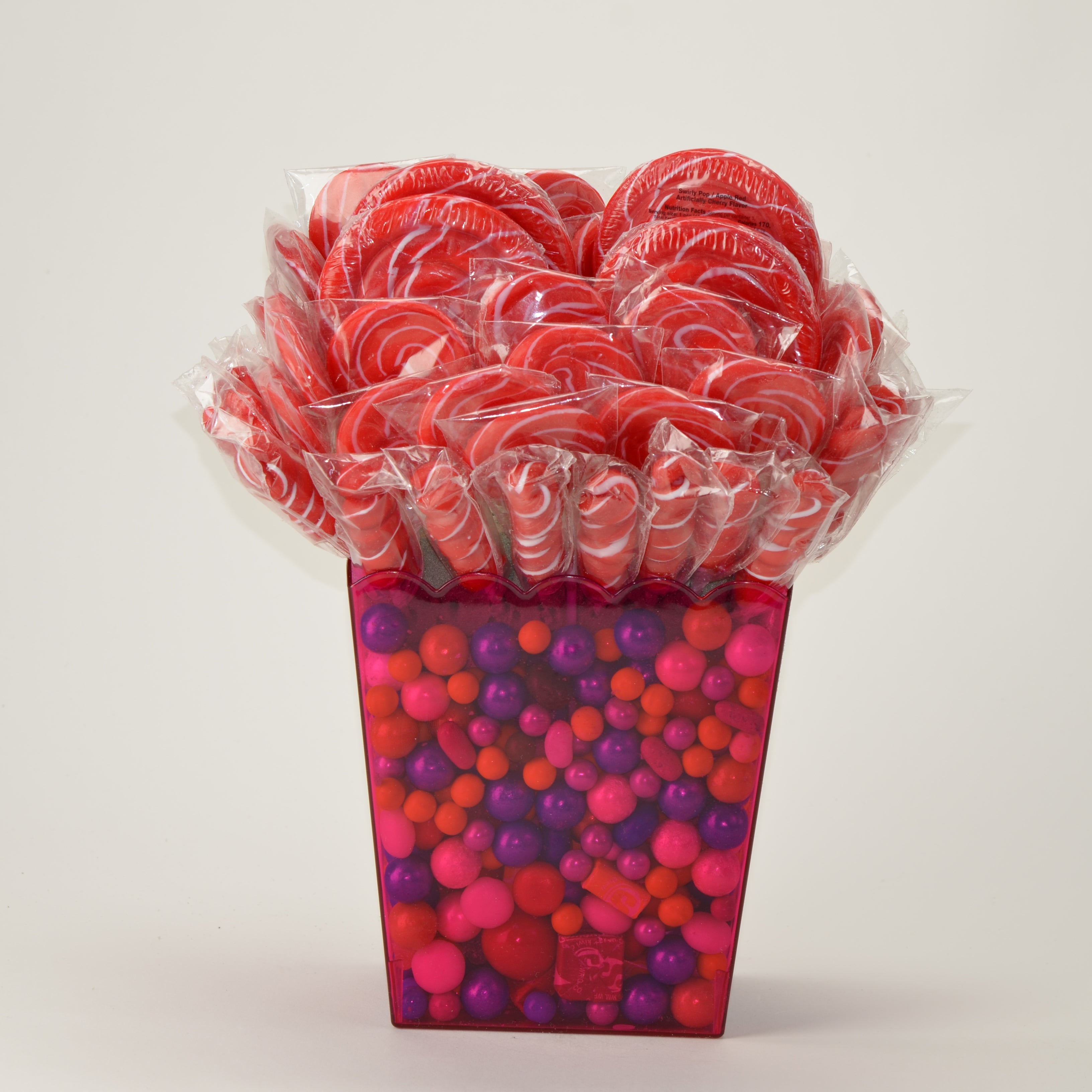 Color Scheme: The container is filled with a visually rich mix of round candies in hot pink, red, orange, and metallic purple. These are likely gumballs or candy-coated chocolates in varying sizes, adding dynamic texture and depth.