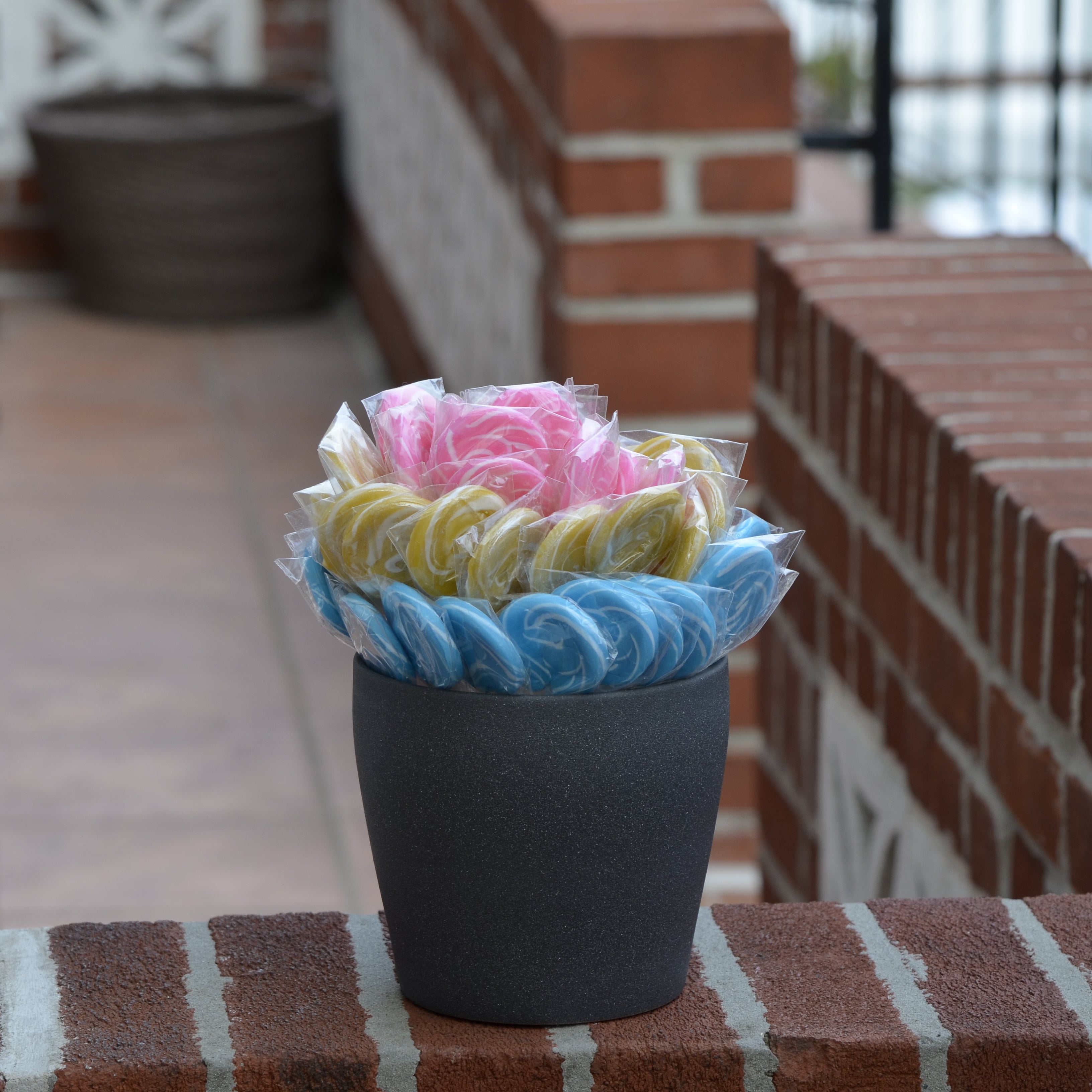 This image displays a candy arrangement featuring exclusively round, spiral lollipops presented in a dark gray, slightly tapered cylindrical container with a textured finish.
